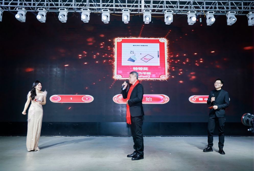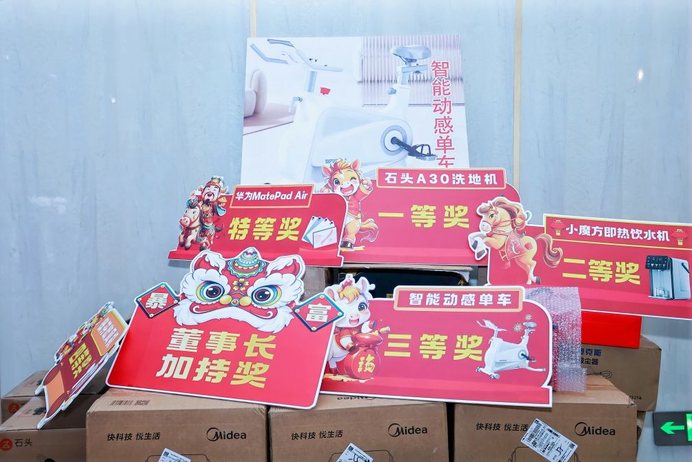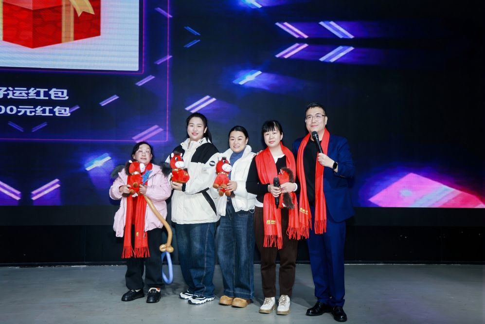 晚会现场惊喜不断、高潮迭起,多轮抽奖与互动环节轮番上演。从幸运四等奖、三等奖、二等奖、一等奖到重磅特等奖与董事长加持奖,层层惊喜点燃全场热情。微信互动点亮Logo、趣味抢答、游戏“策马扬鞭”等环节欢乐不断,而最具氛围感的桌号抽红包环节,更是将喜悦推向顶峰。台上惊喜连连,台下欢呼阵阵,全员沉浸在温馨热烈的氛围中。每一份奖品都承载着美好祝福,每一次开奖都凝聚着同心喜悦,充分展现了晟驰大家庭其乐融融、幸福共享的温暖氛围。
